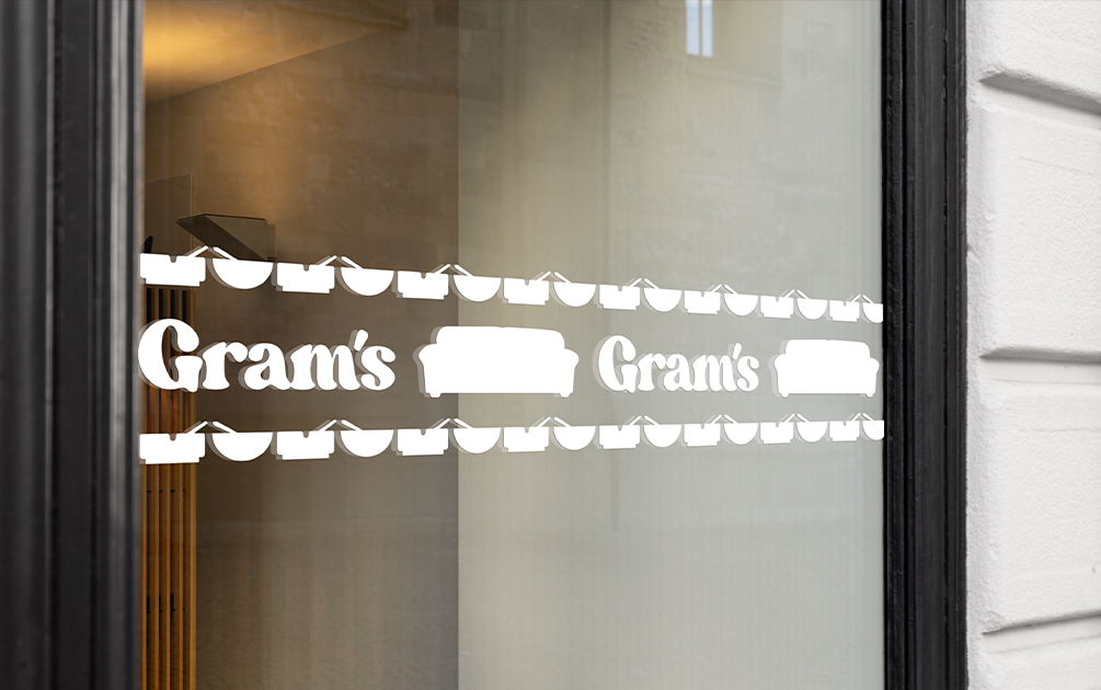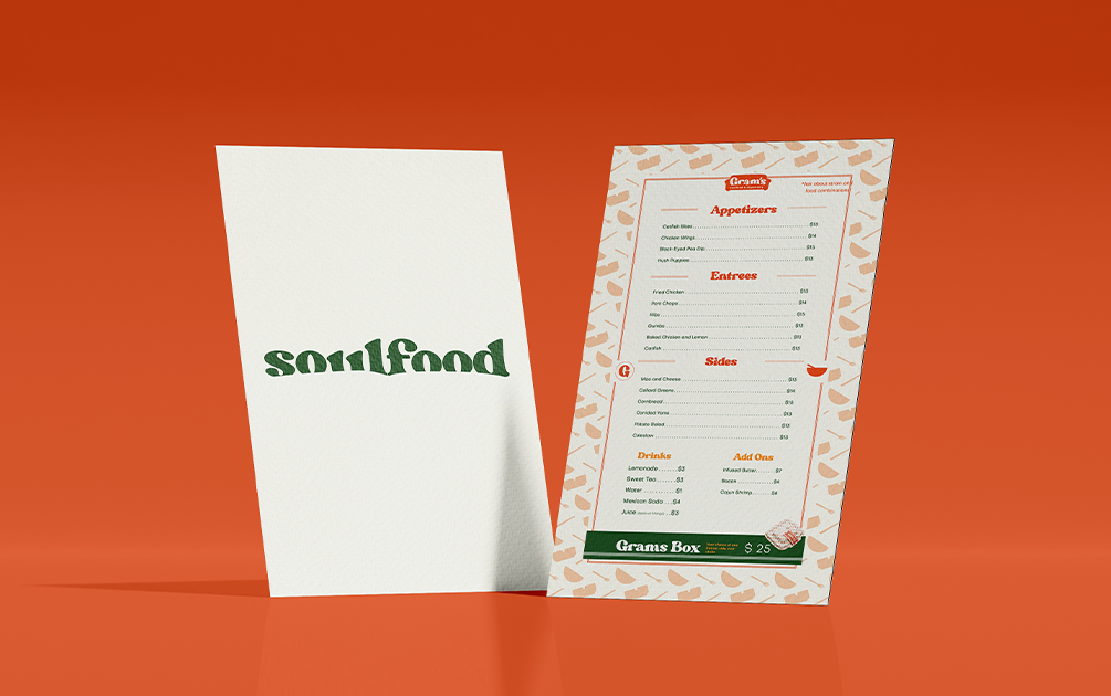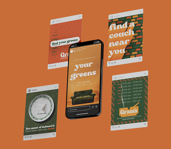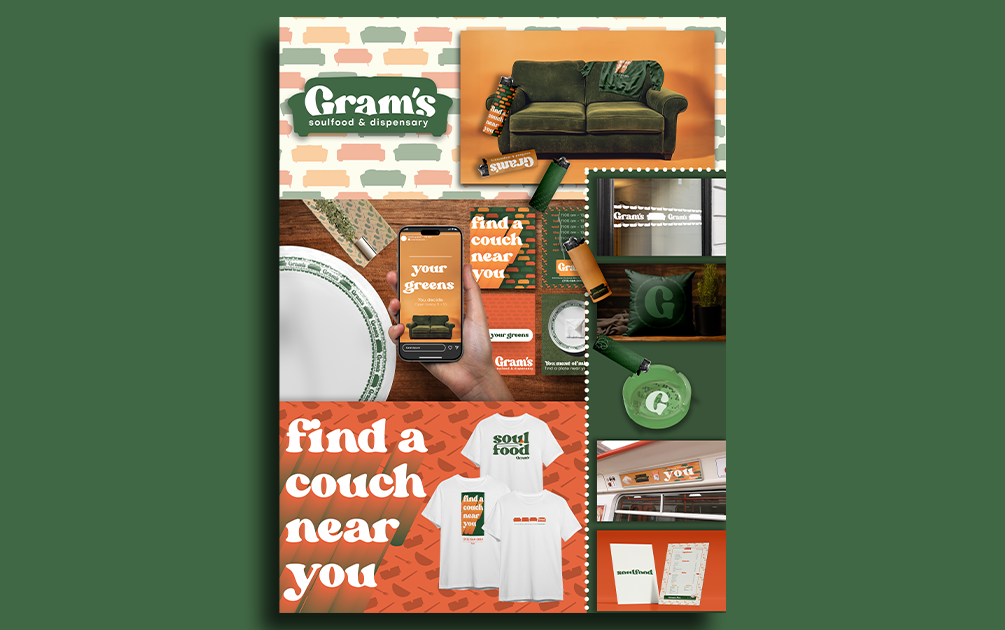 Grams is a soul food dispensary design project rooted in the same warmth and nourishment that Grandmas house provides. The graphics are inviting and the type is reflective of both old fashioned text and the modern edge of dispensaries with the logo ultimately being a couch; the ultimate symbol of comfort. Through embracing comfort and softness the dispensary can distinguish themselves from clinical and modern aesthetics, intentionally inviting guests into their home. Bridging past and present traditions to supply a contemporary look at approachability rather than exclusivity .