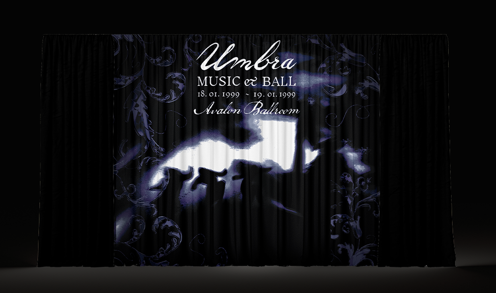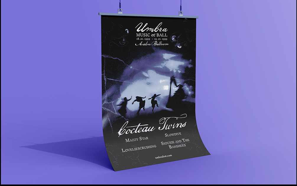 A London based music festival in the 1990s featuring shoegaze, and dreampop music. The design was rooted in dark fantasy adjacent visuals to align with the sounds of the artist and feel of the venue and overall program. The poster draws from the dark and hazy immersive qualities of the genre amid the subculture energy of the postmodernist era. Straying away from nostalgia and clear imagery, the poster uses texture and shadowy forms. The design project features all deliverables found with a festival, including a custom curtain design.